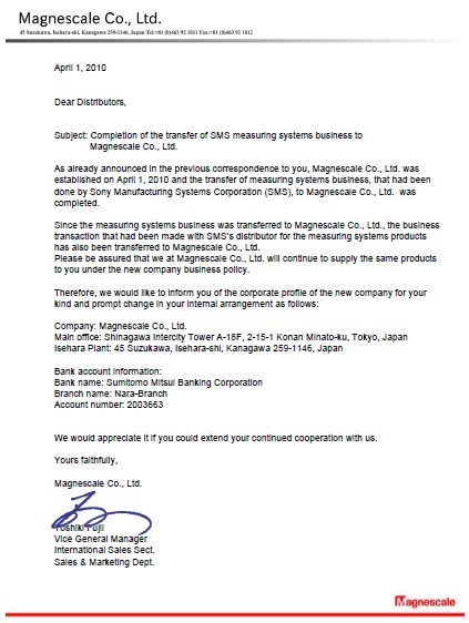 SONY制造系統株式會社成立于1965年,并生產磁尺產品,在全球市場中享有盛譽。與2014年4月1日變更為:Magnescale Co.,Ltd(磁尺株式會社)。之前生產的所以探規、磁尺、計數器等產品,規格型號、技術參數不作改變,請各位請老客戶相互轉告。在此表示感謝!