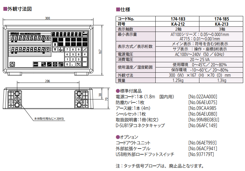 產(chǎn)品介紹日本三豐mitutoyo KA-200系列計數(shù)器 KA-212,KA-213,KA-13、KA-12數(shù)顯表 技術(shù)參數(shù):常規(guī) 輸入端口數(shù): 2, 3 分辨率: 0.001mm, 0.005mm, .0001", .0005" (可轉(zhuǎn)換) 顯示: 7位LED和一個負(fù)號[-]標(biāo)志 電源: 100V-240V AC, 50/60Hz 重量: 1.1kg (2軸), 1.2kg (3軸) 特點 ?帶有10坐標(biāo)功能和現(xiàn)有KL計數(shù)器功能的高性價比2/3軸計數(shù)器。 ?修改參數(shù)后KA計數(shù)器可作為“標(biāo)準(zhǔn)計數(shù)器”或“車床計數(shù)器”使用。 選件 ?可與現(xiàn)有的AT100系列光柵尺和新型 AT715電磁感應(yīng)光柵尺連接。 938140:電子測頭(柄部直徑:20mm) 935094:電子測頭(柄部直徑:32mm) 09CAB217: RS-232C編碼輸出裝置