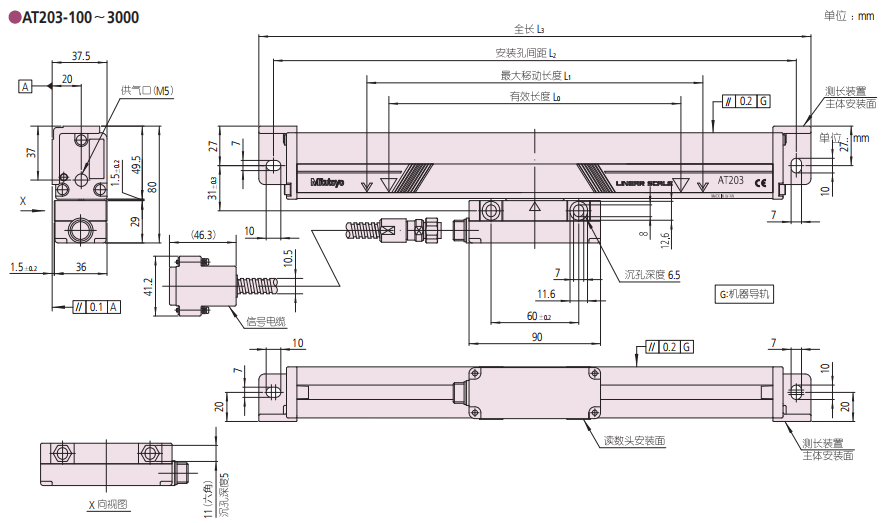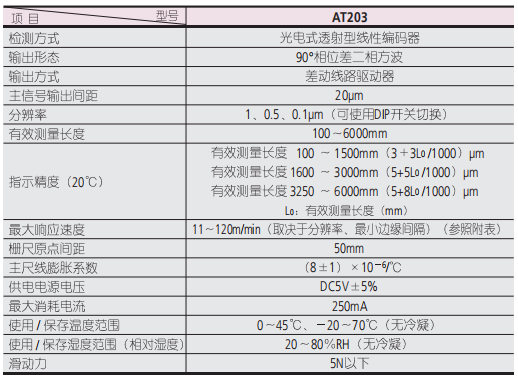 產品介紹日本mitutoyo三豐AT203光柵尺539系列方波輸出型(標準型)產品特點: 6.可連接KA計數器,KLD計數器或PSU-200脈沖信號裝置。 技術參數: 有效測量范圍: 100 - 6000mm20℃時精度: 100 - 1500mm (3+3L/1000)um 輸出波形: 兩路90°相位差正交信號 響應速度: 11—120m/min. 分辨率: 0.1,0.5,1 um 參考點間距: 50mm 塵/水防護等級: 達到IP53防護標準