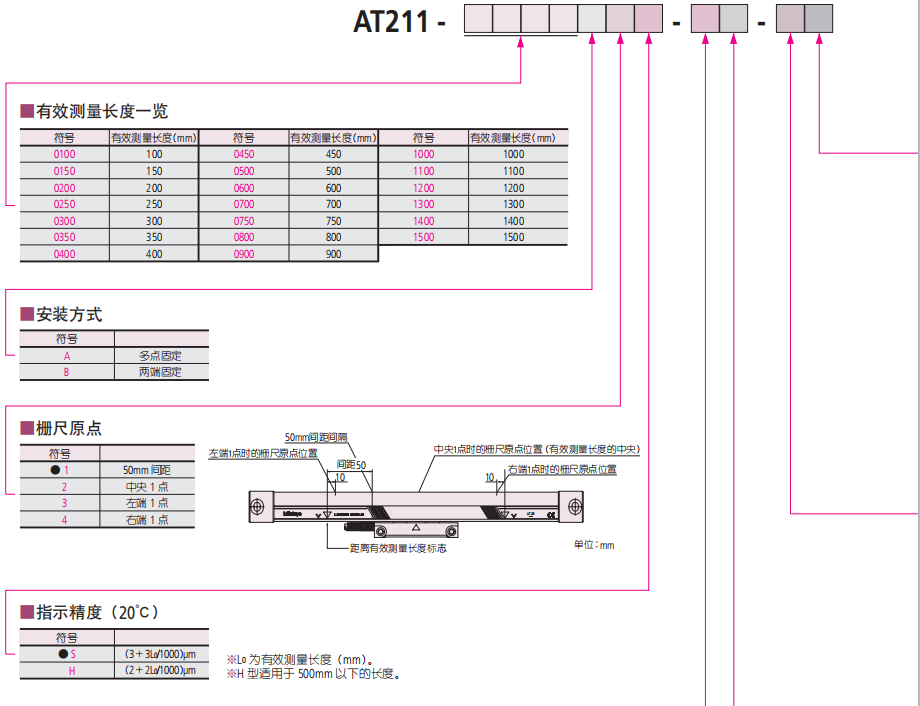 產(chǎn)品介紹AT211系列光柵尺方波輸出型(細(xì)長高速型)高精度光柵尺2um/m 產(chǎn)品特點(diǎn): 1.高精度, 高分辨率封裝型光柵尺,是半導(dǎo)體加工系統(tǒng)和CNC機(jī)床在定位時(shí)進(jìn)行反饋控制的理想工具。 2.兩種型號可供選擇:AT211A多點(diǎn)安裝型,增強(qiáng)了防震性能。AT211B可安裝在機(jī)床兩端。AT211B的尺寸與 AT111細(xì)長型相同。 3.可直接連接控制裝置的細(xì)長型屏蔽型光柵尺。 4.支持0.1-5um的大范圍分辨率,可實(shí)現(xiàn)120m/min的高速響應(yīng) 5.多點(diǎn)固定型是實(shí)現(xiàn)了高耐振性的規(guī)格4.配備光柵尺報(bào)警顯示功能,易于維護(hù) 6.可根據(jù)使用目的選擇光柵尺的增規(guī)格項(xiàng)目選擇方式 技術(shù)參數(shù):