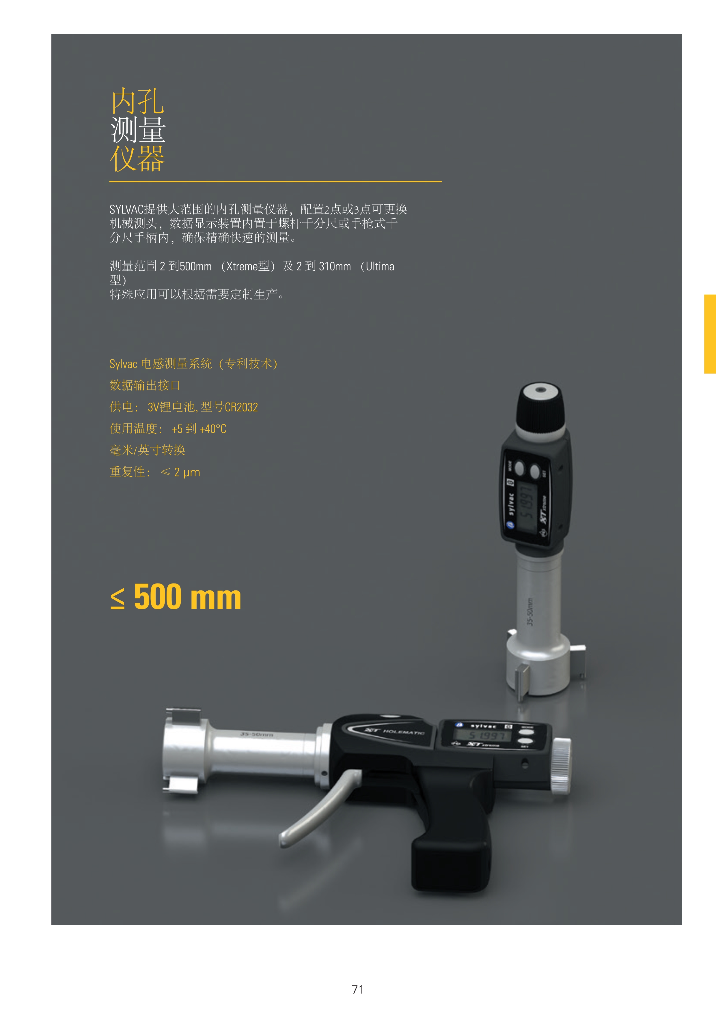 SYLVAC X_Trmem XTH / 槍式三點內徑千分尺.SYLVAC公司的產品范圍極廣,從簡單的機械到高精度的數顯式,可滿足各種內徑測量的要求。操作方式可選擇二點式或三點式,測量速度快、精度高、使用方便,并可選配測頭來測量螺紋花健等特殊工件。 SYLVAC 數顯式內徑千分尺測頭為硬質合金測面,可進行大于12.5mm的盲孔測量,另選特殊測頭可測量環槽、花鍵、螺紋等。
