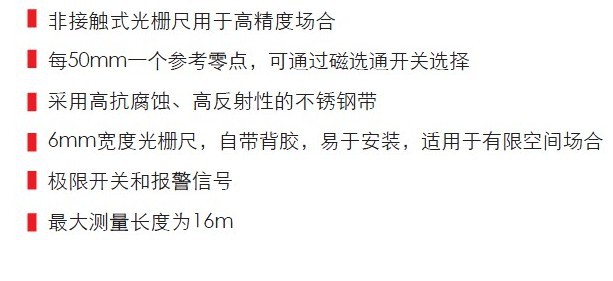產品介紹開放式光柵尺|敞開式數顯尺 EXA FAGOR EXA型開放式數顯尺的特點:粘貼式數顯尺;6mm寬的鋼帶;用于小空間安裝;測量長度可達16m;采用抗腐蝕、反射性的不銹鋼帶。 開放式數顯尺是發格的新產品,他主要是因產業升級應市場需求的而生的尺子。它的精度可達±5μ/m甚至±2μ/m.發格開放式光柵尺主要應用于以下行業:三坐標測量機、半導體制造設備、電子裝配設備、光學檢測設備、印刷線路板掃描機、晶片切割和處理設備、平板印刷機、平板顯示器加工設備、直線電機。 這些行業都有一個特點就是工作無塵,這些機床的工作環境是無塵或者是少塵的,故無需擔心空氣染導致光柵的精度降低。