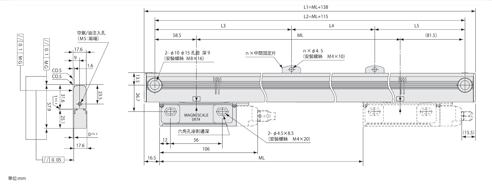 | Measuring length (ML) | 70~2040mm 70, 120, 170, 220, 270, 320, 370, 420, 470, 520, 570, 620, 720, 770, 820, 920, 1020, 1140, 1240, 1340, 1440, 1540, 1640, 1740, 1840, 2040 | 70~2040mm 70, 120, 170, 220, 270, 320, 370, 420, 470, 520, 570, 620, 720, 770, 820, 920, 1020, 1140, 1240, 1340, 1440, 1540, 1640, 1740, 1840, 2040 |